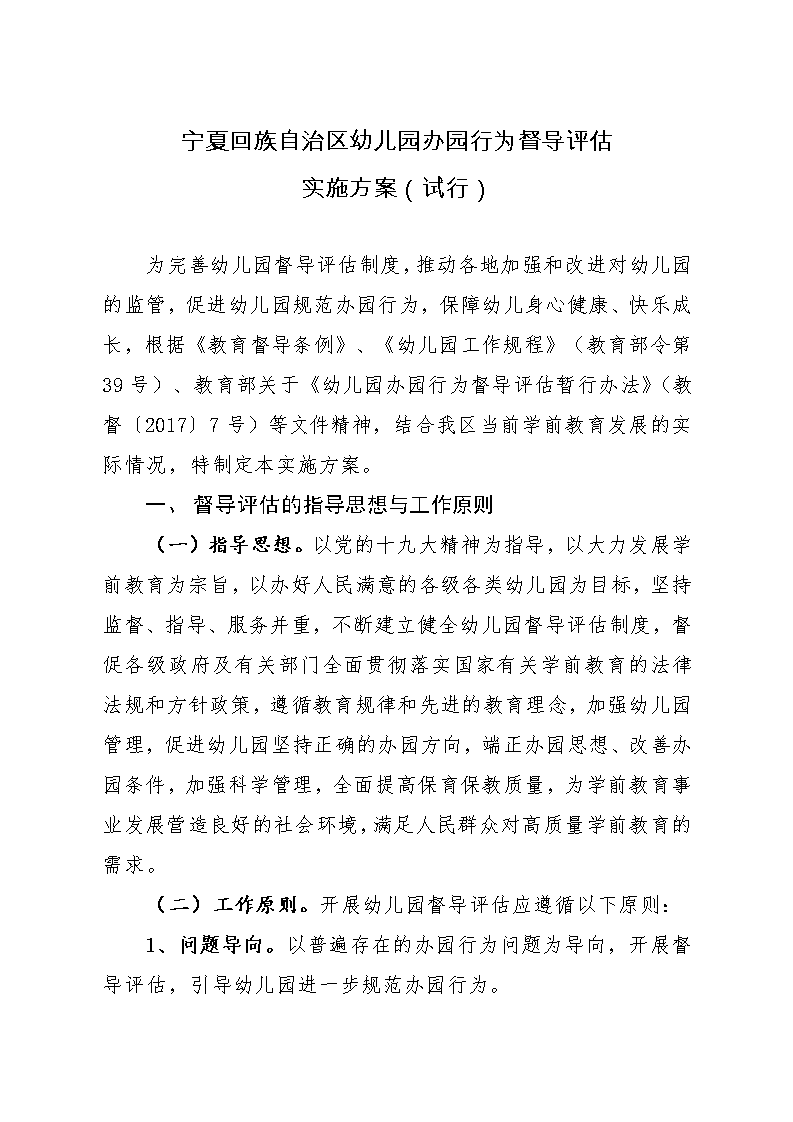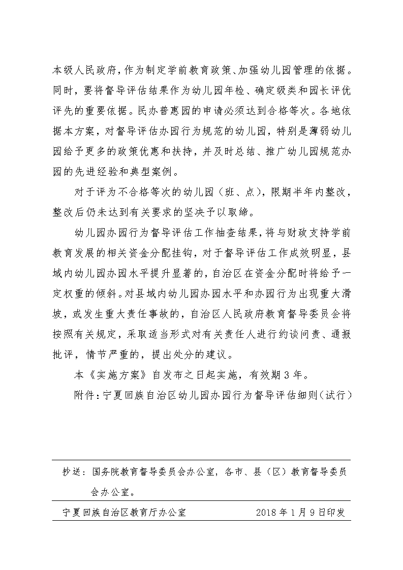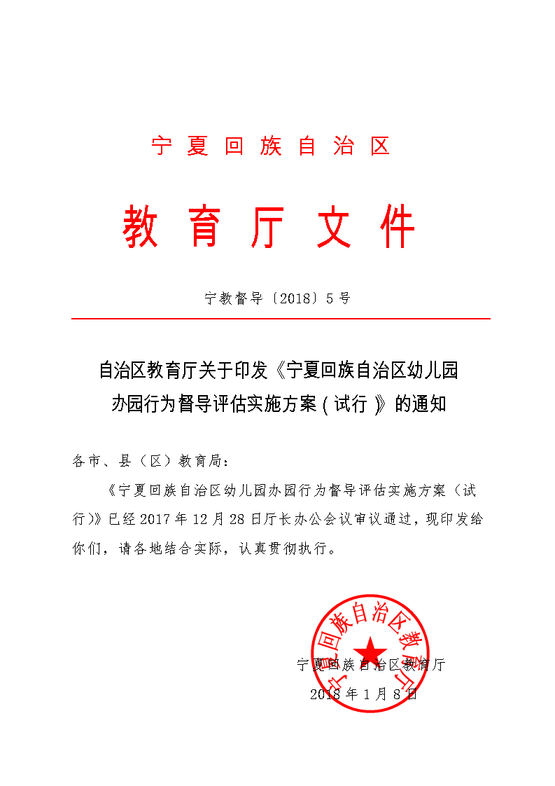自治区教育厅关于印发《宁夏回族自治区幼儿园办园行为督导评估实施方案(试行)》的通知
